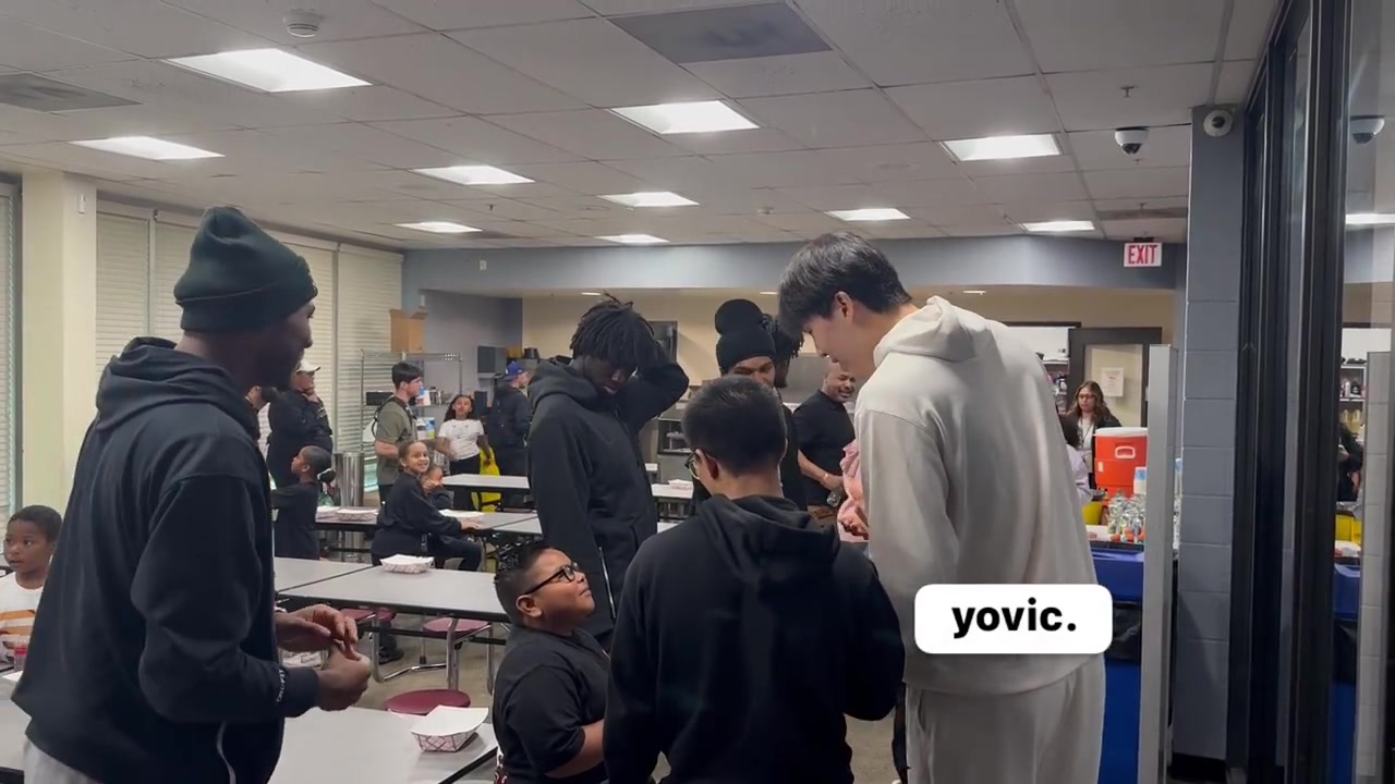 很腼腆呀杨瀚森跟随老大哥利拉德一起参加社区活动