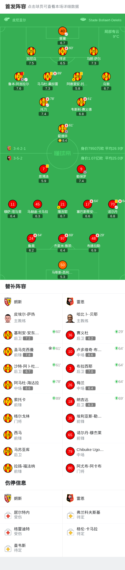 十人朗斯3-1雷恩,鲁本-阿吉拉尔传射+染红,圣马克西曼建功