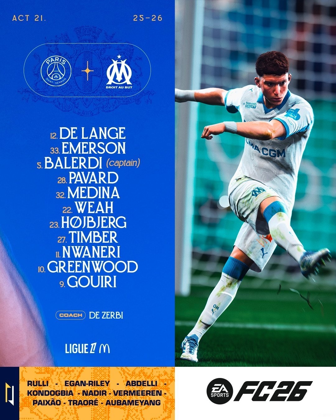 马赛首发:12-德朗格、32-梅迪纳、5-巴列尔迪、28-帕瓦尔、33-埃莫森、23-赫伊别尔、27-昆滕-廷贝尔、22-蒂莫西-维阿、10-格林伍德、11-恩瓦内里、9-古伊里