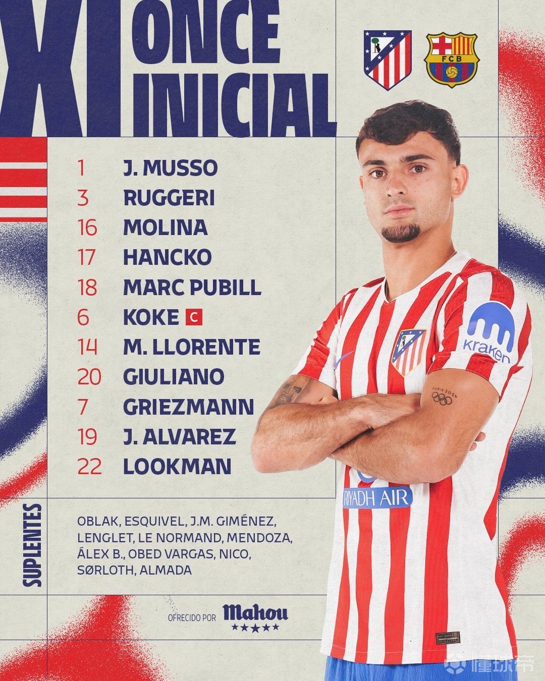 马德里竞技首发:1-穆索、16-莫利纳、18-普维尔、17-汉茨科、3-鲁杰里、20-朱利亚诺-西蒙尼、14-略伦特、6-科克、22-卢克曼、7-格列兹曼、19-阿尔瓦雷斯
