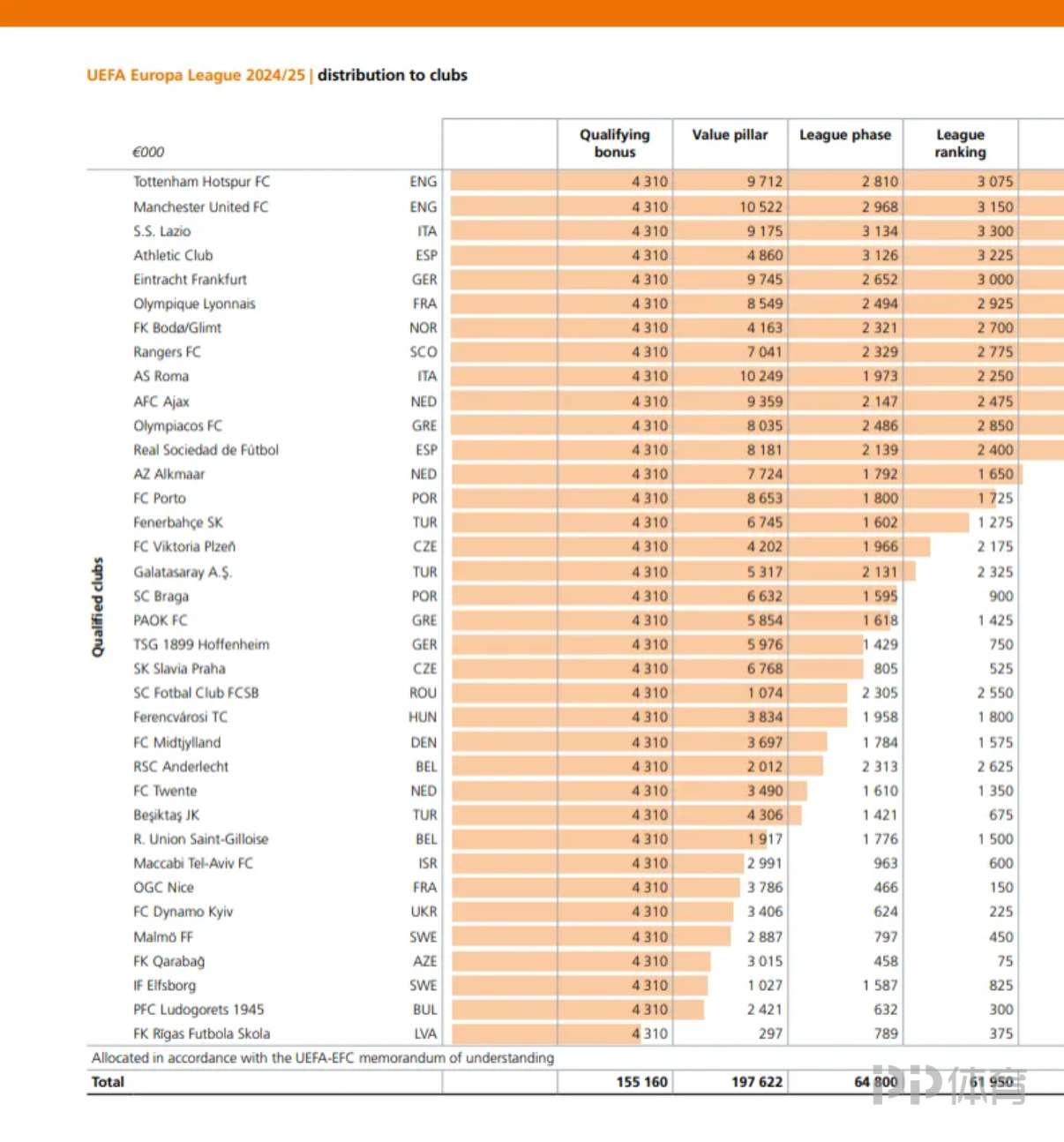 欧联方面,冠军热刺获得约4136万欧元的总奖金位列榜首,亚军曼联获得3640万欧元的奖金位列次席,包括冠亚军共有10队奖金超过两千万,分别是拉齐奥(2417万)、毕尔巴鄂竞技(2397万)、法兰克福(2396万)、里昂(2253万)、博德闪耀(2194万)、流浪者(2071万)、罗马(2053万)、阿贾克斯(2004万)