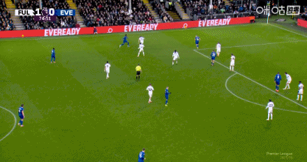 第75分钟,霍尔中路抢点,低射扳平比分,富勒姆1-1埃弗顿