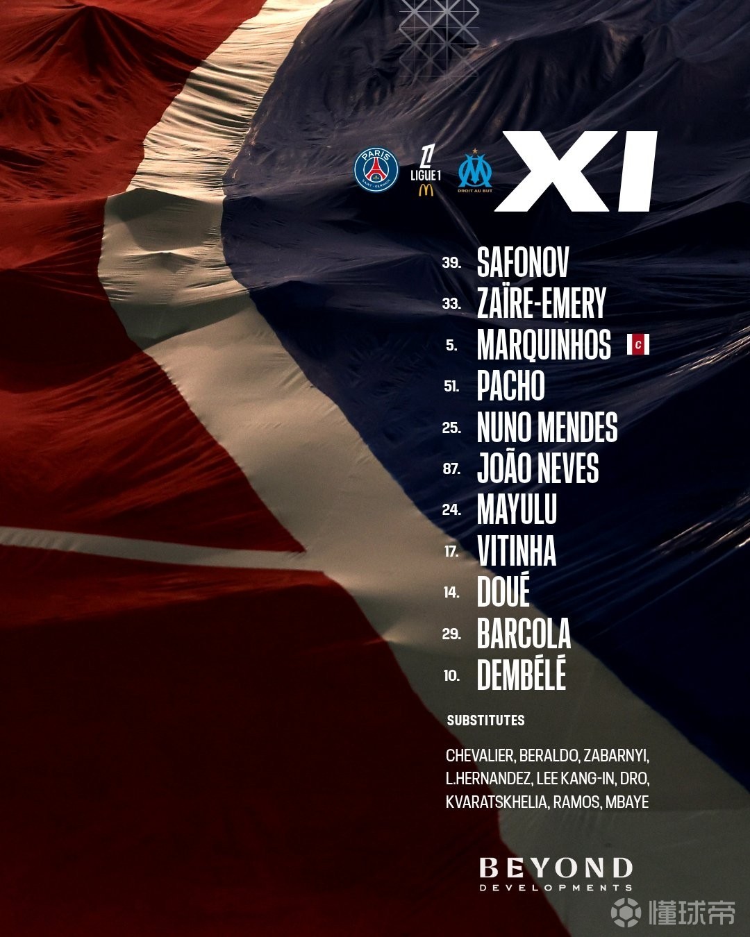 巴黎首发:39-萨福诺夫、25-门德斯、5-马尔基尼奥斯、51-帕乔、33-扎伊尔-埃梅里、17-维蒂尼亚、87-若昂-内维斯、24-马尤卢、10-登贝莱、14-杜埃、29-巴尔科拉